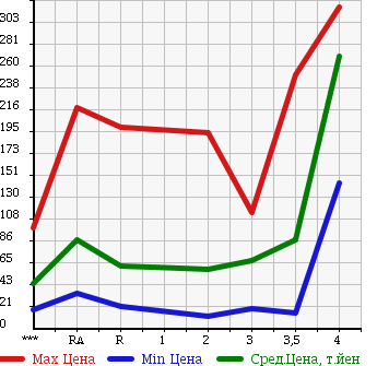 Таблица дана для самой общей оценки уровней цен на рынке. Для более точной оценки используйте таблицы расчетов по типу кузова или модификаций. Расчет "Средней цены 10% самых дешевых" и других дополнительных данных производится при наличии количества статистических данных лотов более 30