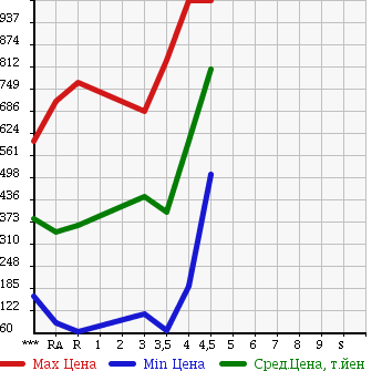 Таблица дана для самой общей оценки уровней цен на рынке. Для более точной оценки используйте таблицы расчетов по типу кузова или модификаций. Расчет "Средней цены 10% самых дешевых" и других дополнительных данных производится при наличии количества статистических данных лотов более 30