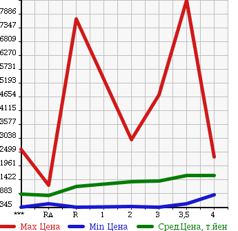 Таблица дана для самой общей оценки уровней цен на рынке. Для более точной оценки используйте таблицы расчетов по типу кузова или модификаций. Расчет "Средней цены 10% самых дешевых" и других дополнительных данных производится при наличии количества статистических данных лотов более 30