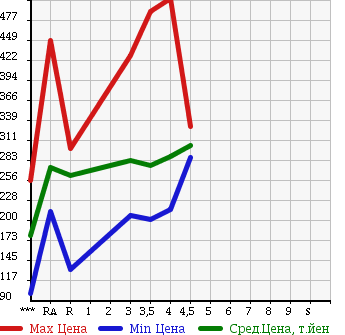Таблица дана для самой общей оценки уровней цен на рынке. Для более точной оценки используйте таблицы расчетов по типу кузова или модификаций. Расчет "Средней цены 10% самых дешевых" и других дополнительных данных производится при наличии количества статистических данных лотов более 30