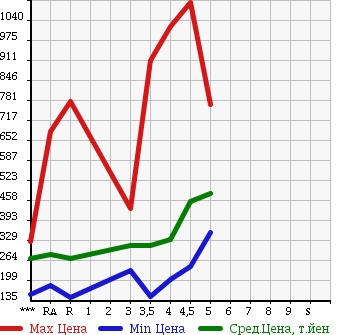 Таблица дана для самой общей оценки уровней цен на рынке. Для более точной оценки используйте таблицы расчетов по типу кузова или модификаций. Расчет "Средней цены 10% самых дешевых" и других дополнительных данных производится при наличии количества статистических данных лотов более 30